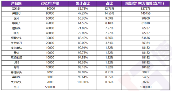 根據工廠的產品的產品族分析,工廠活檢針類產品的銷量占產品的32.7%,為一次性耗材第一,活檢針,鼻刨刀,鋸片,等離子,磨鉆頭,銑刀,顱骨鉆頭量占比總量的85.5%。