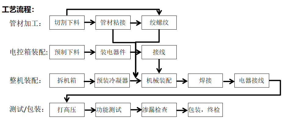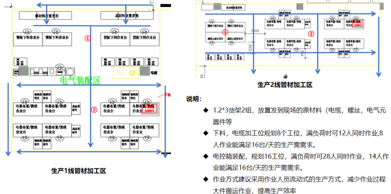 u 電氣裝配接線工位可2人同時一臺機,對面作業,可節省作業空間,年產量達5000臺時,最少排10個工位,年產量達3300臺時,最少排6個工位,
