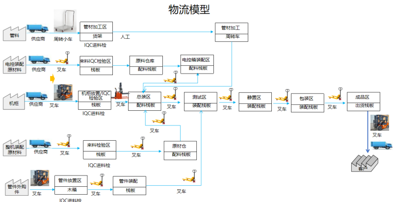 1. 整機裝配工位叉車運送,工序間傳送不方便
